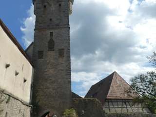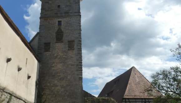 Den Klingentorturm und die Klingentorbastei findet man in der Klingengasse 15. Wie eine INFO-Tafel verrät, wurde der Klingentorturm zwischen 1395 und 1400 erbaut, hat eine Höhe von ca. 37 Meter und diente bis in das 19. Jahrhundert hinein als Wasserturm. Eine weiter INFO-Tafel an der Bastei besagt, dass die Klingentorbastei „erst“ um 1500 errichtet wurde. Die nebenan liegende Kirche St. Wolfgang ist in die Wehranlage mit integriert. Mir hat die Anlage vom Klingentorturm, die ca. 500 Meter nördlich vom Marktplatz liegt, sehr gut gefallen. Am Klingentorturm sind wir wieder hoch auf die Stadtmauer gestiegen und auf der Stadtmauer entlang bis zum Pulverturm gelaufen, wobei wir einen schönen Ausblick auf die Altstadt von Rothenburg und auf die Umgebung hatten.