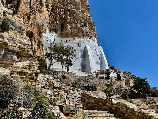 Über 1000 Jahre altes Wehrkloster in den Felsen der Ostküste von Amorgos. Man kann die Kapelle mit 2 sehr alten Ikonen besichtigen und bekommt Süssigkeiten und Wasser von den Mönchen. Zum Kloster muss man vom Parkplatz viele Treppen steigen - schweisstreibend! Achtung: Besichtung für Männer nur in langen Hosen und Frauen nur mit mind. knielangem Rock und keine Hosen. Es gibt keine Kleider im Kloster, also vorsorgen. Die Mönche erwarten auch eine kleine Spende, da kein Eintritt verlangt wird. Der Blick aus dem Wohnzimmer runter auf's Meer ist einzigartig.