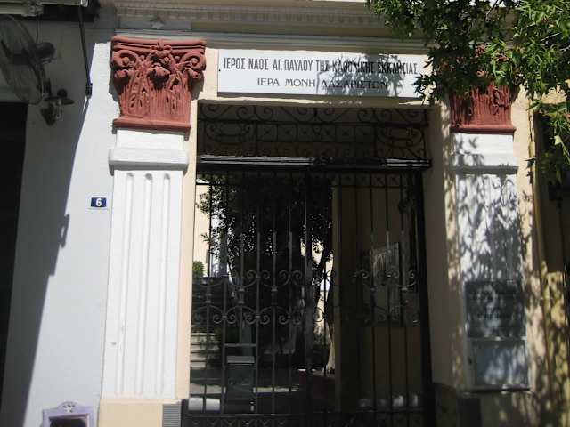 Die Gebäude (Kirche / Kloster) sollen zwischen 1888 und 1892 errichtet worden sein. Sie wurden von den römisch-katholischen Lazaristen bewohnt, einem Orden, der im 17. Jahrhundert in Frankreich gegründet worden war. Die Lazaristen hatten es sich zur Aufgabe gemacht, den Armen das Evangelium nahe zu bringen. Gebaut wurde das Kloster auf Veranlassung des Barons Adolf (Zsolnay) Wix, der Senior Manager der ungarischen Tabak-Gesellschaft Herzog war. Die prächtigen Privatvillen von Wix und Herzog befinden sich in unmittelbarer Nähe des Klosters. Wenige Meter weiter dann das Clubhaus der vornehmen Gesellschaft gefolgt vom Herrenhaus des Tabakhändlers Tokos (Baujahr 1879). Eine ein wenig ungewöhnliche Nachbarschaft für Ordensbrüder, die sich den Armen widmen… Wobei es derer gewiss genug gab, war es doch bereits zu Klassenkämpfen mit den griechischen Tabakarbeitern gekommen. Wie lange die Ordensbrüder in Kavála blieben, konnte ich nicht in Erfahrung bringen. Sicher ist einzig, dass sie irgendwann diese Gebäude räumten und dass das französische Konsulat dort einzog. Heute findet man dort die römisch-katholische Kirche von Kavála. Zum Eintrittsportal: Oben ist die Statue des Hl. Vincent zu sehen, der der Gründer des Ordens der Lazaristen war. (Zu finden im Zentrum, Straße Kiprou, oberhalb des städtischen Parks.) Quellen: Info-Broschüre Tourist Information und Website kavalagreece.gr
