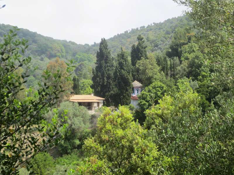 Wir haben das Kloster Kechrias erst im zweiten Anlauf gefunden. Zufahrt ist nur mit Jeep möglich, oder zu Fuß. Es führt eine ziemlich ausgewaschene Schotterstraße in steilen Serpentinen bergab. Auf der linken Seite führt dann ein schmaler Seitenweg zu einem Gebäude, hinter diesem versteckt sich die farbenprächte kleine Kirche. Eine Kuppel in rosa und hellblau, dazu das Grün der umgebenden Pinien- und Olivenbäume - Im Innenhof hat man einen herrlichen Ausblick auf das Meer, um Olivenhaine und - in der Ferne - den Pilion.