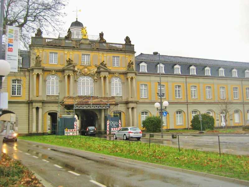 Das ehemalige Kurfürstliche Schloss umfasst einen großen rechteckigen Baukomplex plus einen weiteren Flügel, der sich in östlicher Richtung entlang der Franziskaner Straße bzw. des Regina-Pacis-Weges hinzieht. Durch diesen Flügel gehen drei Tore – zuerst das Tor, durch das die Stockerstraße verläuft, dann – weiter östlich – ein Tor für die Adenauer-Allee und den Richtung Südstadt fließenden Verkehr und letztendlich rechts daneben das bekannte Koblenzer- oder Michaelstor, durch das der stadteinwärts ins Zentrum fahrende Verkehr fließt. Während die ersten zwei genannten Tore völlig unspektakulär sind, ist das Koblenzer-Tor prächtig dekoriert – mit dem Erzengel Michael, dem kurfürstlichen Wappen und vier Doppelsäulen mit vier Skulpturen, die für die Tugenden des Ritterordens stehen (Frömmigkeit, Ausdauer, Stärke und Treue). Denn - in früheren Zeiten - war dieser Trakt der Sitz des Ordens vom Heiligen Michael und das Tor stammt aus Mitte der 1750er Jahre. Die links und rechts des Tores liegenden Durchgänge waren ursprünglich für die Wach- und Zollstuben vorgesehen. Insgesamt alles sehr schön anzusehen, hat mir gut gefallen. Und wenn man ab dort noch ein wenig weiter entlang des Schlossflügels Richtung Rhein läuft, kommt man noch am Eingang zum Ägyptischen Museum vorbei und ist schon fast bei der Bastion „Alter Zoll“. Quelle: bonn-region. de