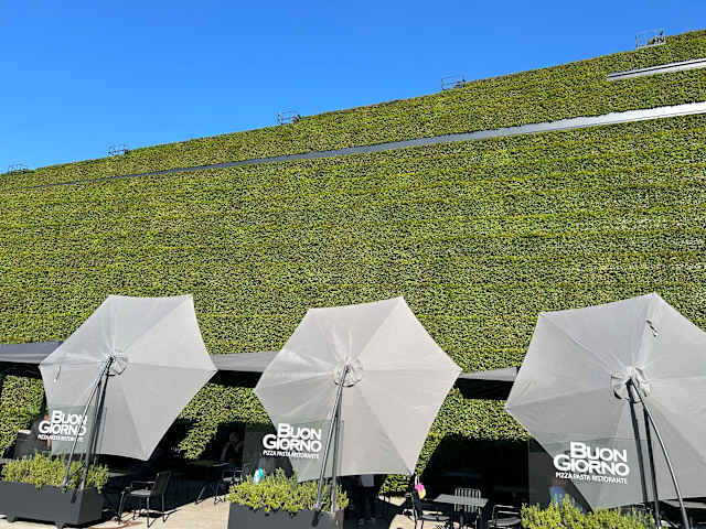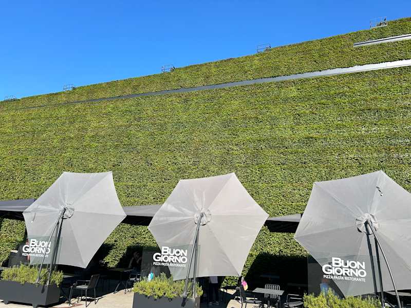 Geschäftszentrum mit grüner Fassade, man sieht praktisch keine Wände mehr, nur Frün, echt fantastisch und aussergewöhnlich