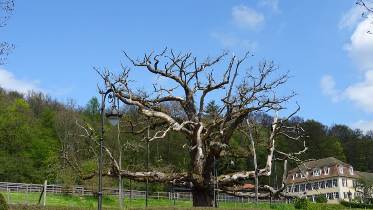 Das genaue Alter der Königseiche oder auch König-Ludwig-Eiche ist nicht bekannt und geht bei Schätzungen um mehrere hundert Jahre auseinander. Die Krone wird heute an vielen Stellen abgestützt, auf einer Seite kann man erkennen, dass der Stamm einen großen Riss hat und teilweise hohl ist - das Areal direkt um den Baum ist abgesperrt. Der beeindruckende Baum ist trotz der Stützen auch ohne Laub ein schönes Fotomotiv.
