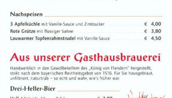 Waren dieses Jahr über Neujahr in Augsburg und wir müssen sagen es war wunderbar sehr schönes kleines Hotel Garni mitten in der Stadt und hatten auch schon beim EINCHECKEN gesagt bekommen das es über NEUJAHR mit dem Essengehen sehr mager in Augsburg aussieht. ABER man hätte vom KÖNIG von Flandern ein mail im Hause das die ab 12 Uhr geöffnet haben, Perfekt dachten wi,r Party,Ausschlafen und Mittagessen! Aufwachen gegen 10, Frühstück bis 10,30Uhr sch..., zu spät dann halt Brunch im König nur wo war der nochmal, GOOGLN Perfekt gleich um die Ecke nur wo ist der Eingang wir liefen tatsächlich zweimal vorbei bis wir die Treppen nach unten fanden mitten in einer Bücherei der empfang war dann ganz herzlich obwohl es keinen Brunch gab dann halt ein leichtes Mittagessen und wenn möglich auch noch Glutenfrei für meine Frau nach einer kurzen Belehrung der Bedienung das sie erst mal nachfragen muß ob Glutenfrei heute machbar sei. Als die Bedienung zurück kam und obwohl sich das sehr Rustikale Brauerei - Restaurant langsam füllte wurde nur für uns Glutenfreies Essen gekcht was wir meinen mehr als nur gewüdigt werden sollte da es zum ersten sehr ungewöhnlich ist das eine Stadt fast ausgestorben wirkt an einem sollchen tag und das ein Brauerei-Gasthof dann auch noch SO KUNDEN FREUNDCH ist das er GLUTENFREIES Essen für seine Gäste zubereitet und dann auch noch so hervoragend und schnell ( Rinderlende auf buntem Kartoffelgemüse mit Champignonrahm und als Dessert Zitronensorbet) Dem Brauer einen Dank für diesen leckeren Nikolausbock ( Roterbock mit weißer Schaumkrone), auch meine Frau mußte davon kosten. FAZIT: Ein riesen Dank für alles und macht weiter so wir werden euch gerne empfehln und vorallem widerkommen.