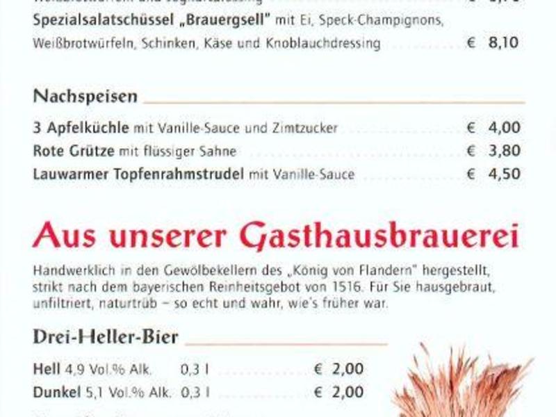 Das König von Flandern braut selbst noch Bier, nämlich das Drei-Heller-Bier (hergestellt nach Pilsner Art) und das Alligator-Bier (dunkler Doppelbock mit ca. 18 % Stammwürze und 6% Alkohol). Wenn man den König von Flandern in Gruppen besucht, kann man das Bier im 3-Liter-Spezialkrug bestellen. Das Treberbrot, das zu allen Speisen und Getränken kostenlos gereicht wird, stellt der König von Flandern selbst her. Es gibt das Brot auch zum mitnehmen als 1- oder 2-Kilo-Laib. Natürlich dürfen auch bayrische Schmankerl wie O'batzter, Bratensulz, Schupfnudeln oder bayrische Weißwürst nicht fehlen. Zu empfehlen sind auch die Salate, sowie die kalten Speisen wie Pressack oder Bierfahrerbrotzeit. Beim Essen aus der Brauerpfanne gibts kostenlosen Nachschlag, solange noch was da ist. Essen mehrere Personen an einer Brauerpfanne, gibt es den Nachschlag leider nicht mehr. Gegessen wird im Brauereikeller. Man kann an manchen Tagen bei der Bierherstellung zusehen. Es riecht dort immer nach Brauerei und frischem, noch warmen, Bier. Lagebeschreibung: König von Flandern im Bader-Keller, Karolinenstr. 12, 86150 Augsburg Hinweis/Insider-Tipp: Nach mehreren Alligatoren wird es schwierig, die Treppen zum Ausgang hoch zu gehen. Aber das Bier ist zu lecker, als dass man es nicht probiert. Die Speisekarte ist ausdrücklich zum mitnehmen gedacht. Täglich geöffnet von 11:00 Uhr vormittags bis 1:00 Uhr nachts. Am Sonn- und Feiertag von 17:00 Uhr bis 1:00 Uhr nachts. KEIN RUHETAG!