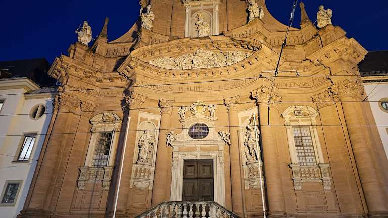Das Neumünster ist vielleicht die schönste und interessanteste Kirche vom Würzburg und ein Besuch des Neumünsters ist aus meiner Sicht unbedingt empfehlenswert. Das Neumünster ist das Zentrum der Verehrung der Frankenapostel (besonders von Kilian). Dort, wo das Neumünster steht, wurde vermutlich bereits in der zweiten Hälfte des 8. Jahrhunderts eine Erinnerungsstätte bzw. Kirche für die Frankenapostel Kilian, Kolonat und Totnan errichtet, die der Sage nach um das Jahr 689 hier an dieser Stelle den Märtyrertod gestorben sind. Um das Jahr 1060 wurde durch den Würzburger Bischof Adalbero das Chorherrenstift Neumünster gegründet. Dieses Stift erhielt eine Kirche, aus der sich das heutige Neumünster entwickelte. Diese ursprüngliche Stiftskirche wurde im Laufe der Jahrhunderte mehrfach erweitert und umgebaut. Ende des 17. / Anfang des 18. Jahrhunderts erfuhr das Neumünster eine einschneidende Veränderungen, bei denen auch die eindrucksvolle Barockfassade entstand. Auch die barocke Ausstattung des Innenraums, die Fresko-Malereien und die Ausmalung der Kuppel stammen ebenfalls aus dem 18. Jahrhundert. Man kann sagen, dass die Innenausstattung 1781 vollendet wurde. Durch den verheerenden Bombenangriff am 16. März 1945 wurde auch das Neumünster beschädigt, jedoch nicht so stark wie der Dom oder wie die meisten Gebäude der Innenstadt. Noch im Jahr 1945 wurde mit der Wiederherstellung des Neumünsters begonnen. Im Neumünster befindet sich in der Krypta der Kiliansschrein mit den angeblichen Gebeinen der drei Frankenapostel Kilian, Kolonat und Totnan.
