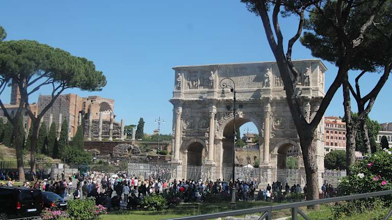 Der Konstantinsbogen ist ein Triumphbogen zwischen dem Forum Romanum und dem Kolosseum. Der Konstantinsbogen ist der größte erhaltene römische Triumphbogen und das letzte große Denkmal des kaiserlichen Roms. Der Konstantinsbogen ist 21 Meter hoch und besteht aus drei separaten Bögen. Der Konstantinsbogen wurde zu Ehren des Kaisers Konstantin in Erinnerung an dessen Sieg in der Schlacht an der Milvischen Brücke im Jahre 312 über seinen Widersacher Maxentius errichtet. Angeblich soll Konstantin vor dem Kampf eine Vision gehabt haben. Demnach sei ihm am Himmel das Kreuz erschienen, das er daraufhin auf die Fahnen seiner Truppen aufbringen ließ. Kaiser Konstantin (ca. 280 bis 337) regierte Rom in einer Zeit des Umbruchs. Er erkannte das Christentum als Religion an. Kaiser Konstantin stellte somit die Weichen, dass das Christentum die Staatsreligion im Römischen Reich wurde.Schon wenige Jahre nach Errichtung seines Denkmals verlegte Konstantin den Sitz der Reichshauptstadt nach Konstantinopel. Er ging als erster christlicher Kaiser in die Geschichte ein. Unsere Reiseleiterin erklärte uns: Die Reliefs des Konstantinsbogens zeigen Szenen religiöser Zeremonien und Opfer und erklären Konstantins Verbundenheit mit dem Christentum. Die acht an der Nord- und Südseite des Bogens angeordneten Rundbilder zeigen Jagd- und Opferszenen und resultieren vermutlich von einem kaiserlichen Jagddenkmal, das einst Kaiser Hadrian (117–238 n. Chr.) gewidmet war. Der Konstantinsbogen war für uns sehr beeindruckend.