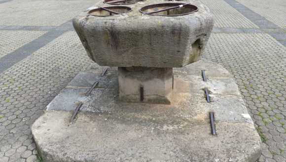Auf dem westlichen Marktplatz von Bad Königshofen im Grabfeld steht eine steinerne Sehenswürdigkeit, die man beim vorbei gehen für einen Stein mit mehreren Taufbecken halten könnte. Bei näherem Hinsehen entdeckt man jedoch eine Plakette die den Hinweis auf ein Getreide-Eichmaß aus dem Jahre 1525 gibt. Es ist ein alter Konrmessstein mit halbkugelige Becken verschiedenen Durchmessers die nach unten geöffnet sind. Hier konnten die Händler nach „gerütteltem und gestrichen Maß“ das Getreide in die darunter hängenden Säcke rinnen lassen. Die Löcher konnten auch verschlossen werden. Das Getreide-Eichmass der vier Becken waren für ¼, ½, ¾ und 1/1 Metzen vorgesehen.