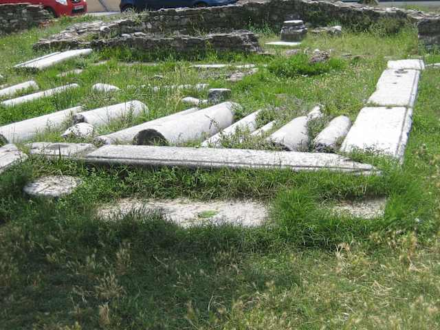 Laut Infotafel vor Ort: Die Überreste der frühchristlichen Basilika (auch kreuzförmige Basilika genannt) wurden 1930 entdeckt, als es am dortigen Platz (Platz des 28. Oktobers) zu Bauarbeiten kam. Ein Teil der Überreste wurde freigelegt, allerdings wurden die Ausgrabungen nicht beendet. Erst nach dem Zweiten Weltkrieg - 1948 - nahm die Französische Schule von Athen die Grabungen wieder auf. Abgesehen von der Kirche wurden auch Überreste römischer Häuser mit Mosaikenfußböden freigelegt. Die Basilika stammt aus dem 6. Jahrhundert nach Chr., die Mosaikenfußböden aus dem 2. Jh. nach Chr. Eine andere Quelle verweist auf diese Mosaiken, die man wohl vor gut 10 Jahren noch vor Ort sehen konnte. Das ist heute nicht mehr der Fall. Gekennzeichnet ist der frühere Standort der Apsis der Basilika, zwei Säulen sind zu sehen und einige schöne Bauelemente mit eingemeißelten christlichen Motiven. Nur wenige Schritte oberhalb und rechtsseitig der Basilika kommt man zu einer Platane, deren unterer Stammteil so ausgehöhlt ist, dass man problemlos dort Platz nehmen könnte. Kann man aber nicht, da vor der „Baumhöhle“ ein Holzzaun errichtet wurde. Der Platz des 28. Oktobers liegt in etwa auf der Höhe des Fährhafens / der Flying Dolphins (Denkmal mit Delphinen). Eine enge Gasse führt zwischen den am Hafen liegenden Häusern direkt zum hübschen kleinen Platz. Entfernung ca. 50 m.