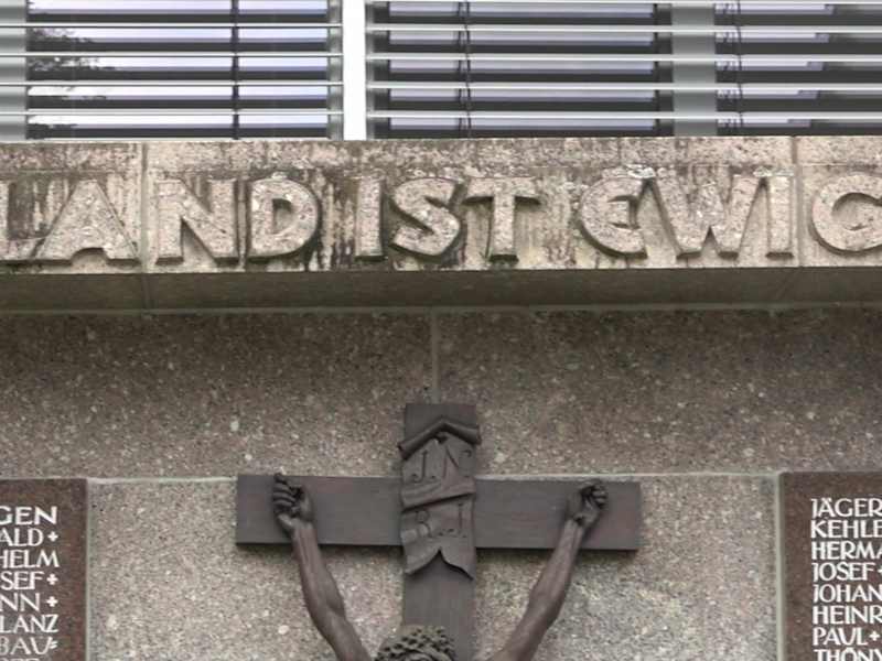 An der Friedhofsmauer in Langenargen, steht ein großes Kriegsgräberdenkmal. Es ist eine freistehende Wand mit kleinem Flachdach. In der Mitte ein Kreuz mit dem Heiland, daneben zwei Gedenktafeln. Darauf die Namen der Gefallenen. Davor ist ein Beet mit Blumenschmuck. Adresse: St.-Anna-Straße 9, 88085 Langenargen Webseite: https://st-martin-langenargen.drs.de/ Geodaten: JG2M+VV Langenargen