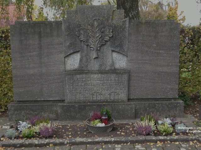 Das Kriegerdenkmal von Möhringen befindet sich direkt bei der Kirche. Es ist eine Grünfläche, umsäumt mit einer Hecke. An der Frontseite ist ein verziertes Eisengitter. Das Denkmal ist ein großes Kreuz mit Eichenlaub. Unterhalb ist ein Inschriftenstein, daran angelehnt zwei Gedenkplatten Inschrift des Gedenksteines: Den Gefallenen der Gemeinde zum ehrenden Gedenken. Auf den Gedenkplatten sind die Namen der Gefallenen beider Weltkriege. Adresse: Kirchweg 5, 88527 Unlingen Webseite: https:// www. seelsorgeeinheit-bussen. de/moehringen Geodaten: 5GGR+65 Unlingen