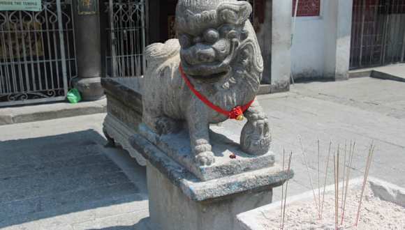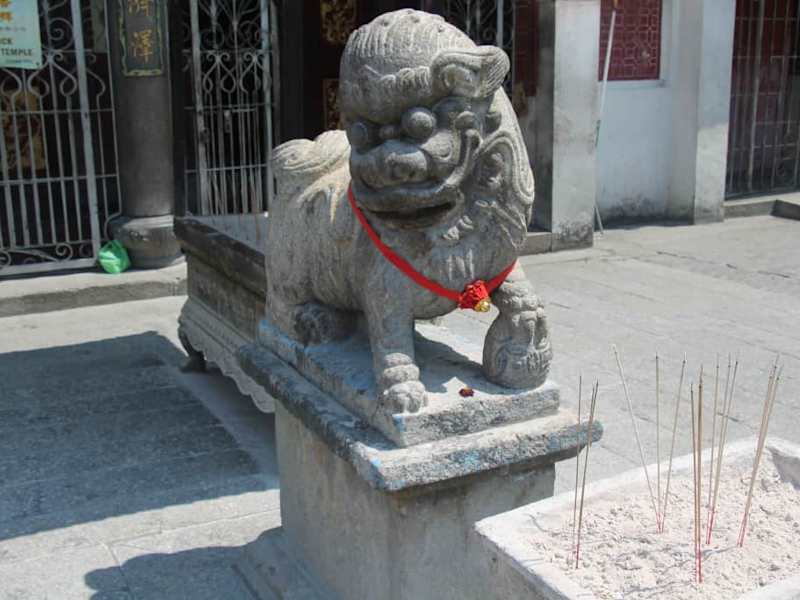 Bei unserem Stadtrundgang besuchten wir auch den Kuan Yin Tempel. Der Kuan Yin Tempel ist der älteste Tempel von Penang. Der Kuan Yin Tempel wurde von den frühen chinesischen kantonesischen und Hokkien-Siedlern gebaut. Der Kuan Yin Tempel wurde ursprünglich Kong Hock Keong Tempel (Kantonesisch-Hokkien Tempel) genannt. Der Tempel wurde zu Ehren von Kuan Yin gebaut, einer gläubigen Buddhistin, von der man sagt, dass sie den ersehnten Zustand des Nirwanas erreichte, sich jedoch entschloss, auf der Erde zu bleiben, um jenen Menschen zu helfen, die bestrebt waren, das Nirwana zu erreichen. Das Nirwana ist für Buddhisten ein Zustand der Vollkommenheit, das Paradies. Im Nirwana gibt es kein Gut und kein Böse, keine Trauer, keine Wut, kein Leid, aber auch kein Glück. Die Seele befindet sich völlig im Gleichgewicht. Es heißt, Kwan Yin war im Begriff, den Himmel zu betreten, blieb aber an der Schwelle stehen, als sie die Schreie der Welt hörte und entschloss sich, auf Erden zu bleiben. Das Innere des Tempels roch sehr stark nach Sandelholz. Sandelholz wird von Gläubigen verwendet, die den Tempel zum Beten aufsuchen und Kuan Yin um Hilfe bei der Suche nach Nirwana bitten. Nach dem Glauben der Buddhisten kann ein Mensch bis zu 500 Mal wiedergeboren werden. Der Kuan Yin Tempel ehrt auch Ma Chor Poh, den heiligen Schutzpatron der Seefahrer, welcher von chinesischen Siedlern hoch angesehen war. Sehr schön fand ich auch die farbigen Wandbilder im Tempel. Rote chinesische Laternen hingen von der Decke in der inneren Gebetskammer herunter, unter der die Statue Kuan Yin saß. Beeindruckend waren auch die zwei Löwenstatuen, die im Tempelhof standen. Wie uns der Reiseleiter erklärte, schützen eine männliche und eine weibliche Löwenstatue den Tempel vor bösen Einflüssen. Der Löwenmann, hält den Reichtum (die Kugel) fest in seinen Händen. Wie wir auch im Kuan Yin Tempel feststellen konnten, dominieren in den chinesischen Tempeln die Farben Rot und Gold. Das Dach des Kuan Yin Tempels war nach oben geschwungen und mit bunten Glücksgötter und Drachen verziert. Im Hof vor dem Haupttempel waren drei Öfen für die rituelle Verbrennung von Papiergeld und andere Utensilien aufgestellt. Der Kuan Yin Tempel war sehr interessant und wir können den Besuch des Tempels auf jeden Fall empfehlen.