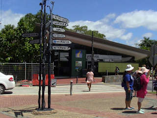 Wir haben eine Tagestour von Cairns aus gebucht. 34 km ging es hoch mit der Kuranda Scenic Railway, der historischen Eisenbahn, und zurück mit derSkyrail, eine Gondelfahrt über den Regenwald. Beides ist sehr beeindruckend und bietet faszinierende Naturausblicke. Kuranda ist ein Bergdörfchen mit viel Natur. Schon der Bahnhof ist eine Besonderheit. Überall Grün und üppig bewachsen, hat man eher den Eindruck in einem Gartenhäuschen angekommen zu sein. Überhaupt alles ähnelt einem grünen Wohnzimmer, oder einem Wintergarten. Dazwischen immer Galerien, die Aboriginalkunst, Trödel, Kitsch aber auch nette Souveniers anbieten. Das ganze hat einen Touch von Trödel- und Flohmarkt. Unbedingt sollte man im German Tucker Wursthouse vorbeischauen. Der Besitzer, selbst Deutscher freut sich immer über Besucher aus der Heimat.