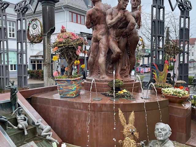 Nackte Menschen, (sonnen-)badende Personen, lüsterne Blicke und eine elegante Dame - das und noch mehr sieht, wenn man sich den Kurschattenbrunnen anschaut, der sich in der Brunnenallee befindet, nur weniger Meter vom Busbahnhof „Treffpunkt“ entfernt.