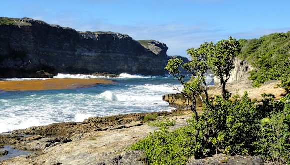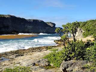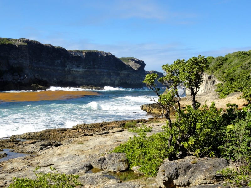 Auf dem Weg von der Ortschaft „Anse-Bertrand“ zur nördlichsten Spitze von Grande Terre, der „Pointe de la Grande Vigie“, erreicht man auf der D-122 kurz vor dem Anstieg eine wunderschöne Lagune, deren Besuch sich lohnt und die sich als Ausgangspunkt für eine Wanderung zum „Höllentor“, der „Porte d´Enfer“ anbietet. Die hohen und schroffen Felsformationen der Ostküste bilden zum Atlantik hin einen Trichter und die Brandung läuft zunehmend sanft in die Lagune ein, die von üppigem Grün flankiert ist. Ab dem Parkplatz mit einem kleinen Gasthaus beginnt der Weg an der östlichen Lagunenseite, wobei Bänke und ein Picknickbereich unter schattenspenden Bäumen zu einer Rast einladen. Bis zum Anstieg des Wanderweges auf die Klippe vergehen etwa 10 Minuten und wer über einen ausreichenden Wasservorrat verfügt, kann von hier aus nicht nur zum „Höllentor“ aufsteigen, sondern von dort auf dem Wanderweg oberhalb der Steilküste bis zum „Trou du Souffleur“ gelangen. Die Lagune der Porte d’Enfer hat einen besonderen Reiz und auch ein kurzer Halt wird mit einem einzigartigen Panorama belohnt.