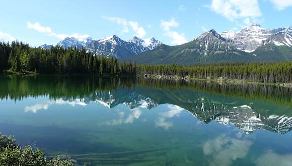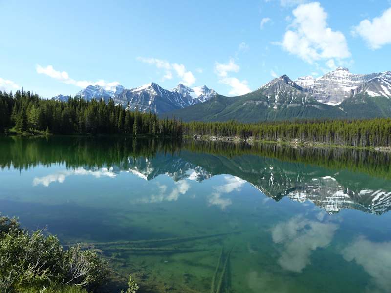 Wir hatten schon etwas vom Herbert Lake gehört, aber man hat so viele Seen mit Spiegelungen von Bergen gesehen. Wir nahmen es nicht für voll, da unser Reiseführer es nicht besonders erwähnte. Auf den ersten Blick wirkt der Herbert Lake unscheinbar. Wir wurden erst richtig aufmerksam als wir so viele Fotoapparate sahen, normalerweise ein Anzeichen für Bären. Die Spiegelung im See ist so klar, die im Hintergrund aufragenden Berge mit den Gipfeln der Waputik Range und der Mount Temple sahen wunderschön aus. Zum Glück hatten wir auch bestes Wetter. Der Herbert Lake liegt nur wenige Meilen nördlich von Lake Louise und ist leicht zugänglich am Columbia Icefields Parkway.