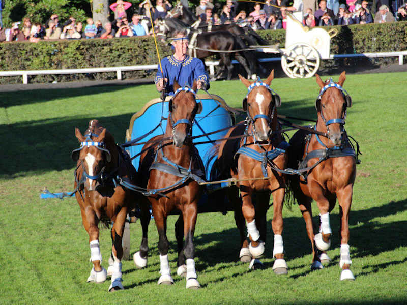 Wir besuchten am 29. September 2013 bei strahlendem Sonnenschein zum ersten Mal die Celler Hengstparade. Beeindruckend ist schon der Menschenauflauf zu den klassischen Gebäuden mit den alten Baumbeständen umgebenen Paradeplatz des Niedersächsischen Landgestüts an dem Flüsschen Fuhse. Vor der Veranstaltung konnte man über das Gestütsgelände spazieren gehen, um sich zur Mittagszeit mit Bratwurst, Brezeln oder Erbsensuppe zu beköstigen. Außerdem konnte man sich in den Remisen in aller Ruhe die edlen historischen Kutschen und Prunkwagen ansehen. Beeindruckend war schon der erste Programmpunkt: die Einfahrt der Honoratioren mit historischen Kutschen wie Landauer, Kommandanten- und Jagdwagen. An der Spitze der Ehrengäste wurde der Niedersächsische Ministerpräsident Weil begrüßt. Zügig ging es dann im Programm weiter. Bei der „Ungarische Post“ reitet ein Reiter auf zwei Pferden stehend und in der zweifachen Fahrschule werden die Hengste nur mit der langen Leine geführt. Am 29.09.2013 war die erstmals auftretende Hannoversche Ponyquadrille mit 24 Reitponys und ihren Reitern zu Gast in Celle. Die Eleganz im Damensattel wurde in edlen Kostümen dargeboten. Dressurdarbietungen auf höchstem Niveau in Einzelauftritten oder hochklassigen Quadrillen gehörten zu den weiteren Programmpunkten. Höhepunkte der diesjährigen Hengstparade aber waren für uns die vier Sechserzüge vor den historischen Hofwagen des hannoverschen Königshauses, die Springquadrille und die Große Dressurquadrille in den leuchtenden roten Uniformen. Die beiden vierspännigen Römerwagen mit ihrem beeindruckenden Abgang bildeten den Abschluss einer gelungenen Veranstaltung.