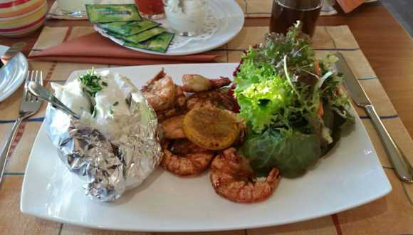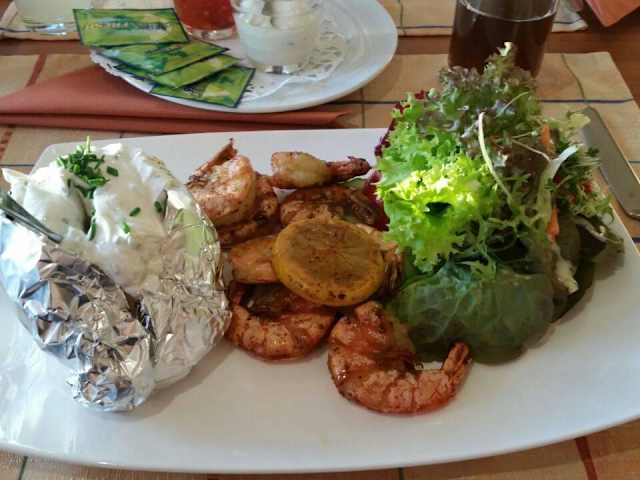 Aufmerksame Bewirtung, sehr leckeres Essen, wunderschöne Ausblick ***** Wir sind mit einer Gruppe von sieben Gästen zum "Gambas all you can eat" dort zum Abendessen gewesen. Wir wurden aufmerksam und nett von den Kellnerinnen begrüßt. Die Gambas waren sehr lecker mit Salbei, Zitrone und etwas Knoblauch mariniert. Geschmacklich so noch nicht erlebt und wahnsinnig lecker. So serviert, dass man sie mit Besteck essen kann aber wir alle konnten und durften mit den Händen essen :) Dazu gab es die bekannte Ofenkartoffel mit Kräuterquark, einen kleinen angemachten Salat und einen recht simplen süß-sauren, leicht scharfen Dip sowie einen leckeren Senf-Mayo Dip. Wir wurden stets gut und aufmerksam bewirtet. Nachschlag wurde mehr als ausreichend angeboten und immer wieder aufs neue super lecker! :) Das Preis-/Leistungsverhältnis hat absolut gestimmt. Für das Ambiente und vor allem dem super Ausblick über das Rheintal und den Taunus bin ich gerne bereit noch etwas mehr zu zahlen. Wir kommen auf jedenfall wieder. Zu empfehlen!