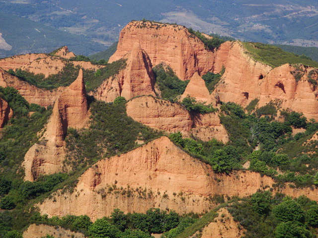 Der Kulturpark "Las Médulas" befindet sich bei dem gleichnamigen Dorf, etwa 25 Kilometer südwestlich von Ponferrada, der Hauptstadt der Region El Bierzo, im äußersten Westen der Provinz León. Dabei handelt es sich um ein Landschaftsbild, dass sich aus einem im 3. Jahrhundert n.Chr. aufgegebenen Goldminenbetrieb, dem wichtigsten des Römischen Reichs, gebildet hat. Die Römer setzten beim Goldabbau viel Wasser ein und füllten es in ein Netzwerk von Galerien, die sie vorher im oberen Teil der Berge geschaffen hatten. Das Wasser erzeugte Risse im Inneren der lehmigen Berge und ließ sie schließlich zusammenbrechen. Im Laufe der Jahre entstand eine einzigartige Landschaft mit Bergen aus rötlichem Sand, Lagunen und Seen sowie jahrhundertealten Kastanien- und Steineichenbäumen. Im Inneren können verschiedene Routen zu Fuß, mit dem Fahrrad oder zu Pferd verfolgt werden. Nähere Informationen bekommt man im Besucherzentrum. Der Komplex wurde 1996 zum Kulturgut erklärt und 1997 von der UNESCO in die Liste des Weltkulturerbes aufgenommen. Homepage: https://patrimonionatural.org/espacios-naturales/monumento-natural/monumento-natural-las-medulas
