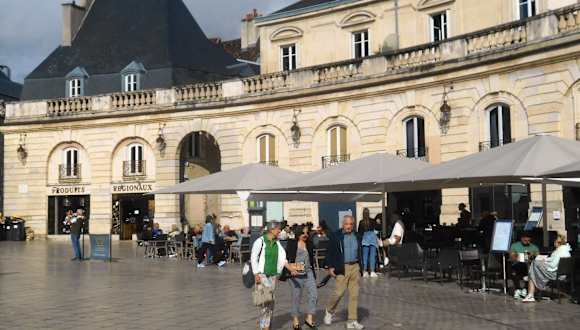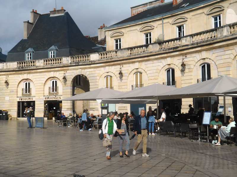 Das Restaurant ist zwar etwas versteckt ohne direkte Front zum Place de la Libération, aber es gibt einen großen Terrassenbereich auf dem Platz. Hier kann man herrlich draußen sitzen und den Blick auf den Palast genießen. Die Speisekarte bietet burgundische Gerichte und dazu eine reichhaltige Auswahl an Weinen.