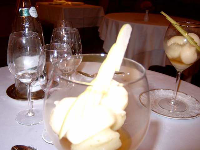 Wie in der Hotelbeschreibung bereits ausgeführt liegt dieses bezaubernde Hotel Restaurant nicht weit vom Mont St. Michel. Empfang und die vor gelagerte kleine Bar sind in einem warmen Holzton mit Steinfußboden und dezenten Licht freundlich gestaltet. Es gibt zwei Speiseräume. Während der Speiseraum zur Straße hin ebenfalls in Holz und Brauntönen gehalten ist, strahlt der andere in weiß mit Blick in den Garten. Letzterer war bei unserem Besuch einer Gesellschaft vorbehalten, so dass wir im vorderen Raum Platz nahmen. Das Restaurant war sehr gut besucht, auch von Personen die nicht im Hotel übernachteten. Wir wurden an einen weiß gedeckten Tisch geleitet der angenehm dekoriert war. Als Aperitif wurde ein Cocktail „Normandy“ gewählt. Ein Teller mit 3 kleinen Häppchen stand schnell auf dem Tisch. Dazu kleine Baguette, die unaufgefordert auch nachgelegt wurden und ausreichend Salzbutter der Normandie. Zur Auswahl stehen 3 Menüs sowie 10 Vorspeisen davon 4 verschiedene Hummer zubereitungen, 4 Fischgerichte, 3 Fleischgerichte sowie ein Kindermenü, separate Dessertkarte. Wir wählten das Menü „Gourmand“, 4 Gänge für 48 €, dazu zum 1. Gang ein Glas „Coteaux de Saumur“ das Glas 0. 01 l zu 5 E und ein halbe Flasche „Moulin de la lagune zu 23. 50 € 1. Amuse Bouche Kleine Tomate gefüllt mit Ziegenkäse, Melone mit Schinken und ein Schälchen Tapenade, dazu für jeden zwei Scheiben Baguette. Einfacher, aber schmackhafte Auftakt. Lediglich die Tomate mit Füllung war Kühlschrank kalt. 2. Amuse Bouche Lachsrillette mit Basilikumcreme und roten Kaviar. Lachs grob durch den „Wolf“ gedreht, luftige Creme. 1. Gang Foie Gras mit Apfelmus, Caramel Die Foie Gras leicht mit Calvados parfümiert, gefüllt mit Rhabarber. Eine schöne Zusammenstellung der Aromen, lediglich der Caramel war eigentlich überflüssig. 2. Gang Lamm mit Sommerknoblauch, Kartoffelpüree und Lammjus. Eine rosa gebratene Scheibe vom Carre und 2 Scheiben vom Rücken waren gut gewürzt, hatte aber leider kaum „Lammgeschmack“, luftiges Püree und leichter Jus. Bei 4 Gängen hatte dieser Gang etwas mehr auf dem Teller haben können. 3. Gang Käse der Normandie Auf einem Wagen wurden ca. 25 verschiedene gut gereifte Käsesorten vorgefahren. Wir wählten Camembert, Livarot und Pont l’ Évêque sowie ein in Asche gewälzter Ziegenkäse. 4. Gang Apfelsorbet mit Calvados Ein einfaches aber wohlschmeckendes Dessert als Abschluss. Mit einem Calvados „Doyen d’Age“ Groult Pas d’auge und einen „Cafe ou inffusion“ wurde ein typisches normannisches Abendessen beschlossen. Wer die südwestliche Normandie besucht oder auf den Weg in die Bretagne ist, sollte hier einen Stopp einlegen.