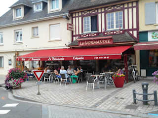 Die Brasserie liegt an einem tagsüber echt verkehrsreichen Punkt im Zentrum von Pont-l'Évêque (Place Jean Bureau, 6), aber wenn abends der Durchgangsverkehr nachlässt, kann man hier auch gut draußen sitzen.