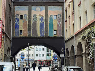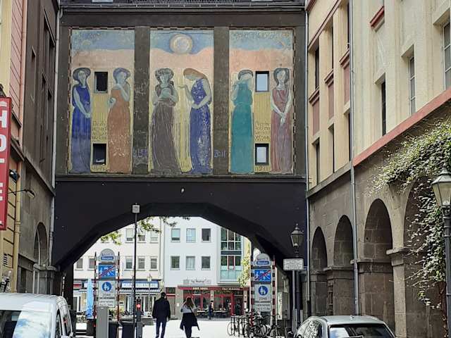 Auf Wand eines Gebäudes, das den Durchgang von der kleinen Gasse zum Münzplatz überbrückt, wurde 1911 von dem Maler William Straube im Auftrag der Stadt Koblenz ein dreiteiliges Wandgemälde angebracht, das sechs Frauen darstellt und für die Hoffnung und die Trauer stehen soll. In das Bild integriert sind zwei Zeilen eines Gedichts von Goethe: „Die Zeit, sie mäht so Rosen als Dornen“ und „Aber das treibt immer wieder von vornen“.