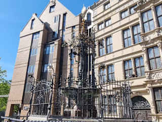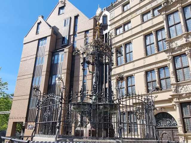 Das 1981/83 wieder aufgebaute Leibniz-Haus am Holzmarkt hat mir sehr gut gefallen. Die Fassade des Hauses ist eine sehr schöne Rekonstruktion der Fassade von 1652. Besonders schön die Bilderszenen (biblische / antike) am Erker. Die Räumlichkeiten dahinter sind allerdings modern, sind heute „Gästehaus und Internationales Begegnungszentrum der Hannoverschen Hochschulen“. Zu dem dreiteiligen Baukomplex: Das Leibniz-Haus liegt mittig zwischen – rechts – einem schönen Haus von 1881 und – links – einem Haus von 1983, das in seiner Bauart gut ins Bild passt. Gefiel mir sehr gut. Dass man sich entschied, das neue alte Leibniz-Haus am Holzmarkt und nicht an seinem ursprünglichen Platz in der Schmiedestraße 10 wieder aufzubauen, ist nachzuvollziehen: Es mangelte an Platz. Neue Häuser waren in der Schmiedestraße gebaut worden, die – denke ich - so gar nicht zu dem schönen alten Haus gepasst hätten. Hingegen passt es perfekt in die Altstadt mit ihren hübschen Fachwerkhäusern. Kurz zur Geschichte: Ende des 15. Jahrhunderts für eine der Oberschicht angehörenden Familie errichtet, erhielt das Haus 1652 die heute zu sehende Fassade und wurde ab Ende des 17. Jahrhunderts (1698) von dem bekannten Gelehrten Gottfried Wilhelm Leibniz bis zu seinem Tod bewohnt. Im Zweiten Weltkrieg 1943 zerstört, beschloss die Stadt in den 60er Jahren, das Haus wieder aufzubauen. 1981 war es dann soweit: Mithilfe alter Pläne, Fotos und Überbleibsel der zerstörten Fassade konnte die heute zu sehende erbaut werden. Vor dem Haus steht ein schöner Brunnen. Dazu gibt es hier den gesonderten Reisetipp „Holzmarktbrunnen“. Quelle: Oehler-Austin / Rundgänge durch die Geschichte