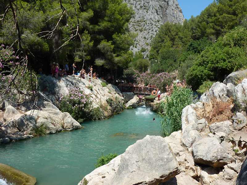 Die Wasserfälle von Algar, ca. 3 km von Callosa d'En Sarria im Hinterland von Altea gelegen, bieten in herrlicher Bergkulisse Natur und Erfrischung. Der Ort selbst besteht hauptsächlich aus Gaststätten, Souvenirläden und natürlich kostenpflichtigen Parkmöglichkeiten. Wer zeitig kommt, hat vielleicht Glück, oberhalb des Eingangs einen der wenigen Plätze ohne Gebühren (allerdings ziemlich verstaubt) frei zu finden. Der manchmal ziemlich rutschige Rundgang führt teilweise über Treppen, Steine und Brücken an Wasserläufen und -fällen vorbei. Es gibt sowohl seichte als auch tiefere Badestellen mit mehr oder weniger starkem Zufluss. Am Ende passiert man oberhalb ein kleines Souvenirgeschäft mit Picknickplatz. Der Eintritt beträgt für Erwachsene 4, für Kinder 3 Euro. Auch wenn es ziemlich verlockend scheint, gerade im heißen August Abkühlung im stets frischeren Bergwasser zu suchen, würde ich von einem Besuch zu dieser Zeit eher abraten. Dann ist nämlich praktisch das gesamte Gebiet hoffnungslos überlaufen. So gut wie jeder schattige Platz unter den Bäumen wird von Familien mit teilweise kompletter Campingausrüstung belegt. Selbst im Wasser kann es eng werden. Wer also mehr Ruhe und Natur genießen möchte, sollte eher auf die restlichen Monate ausweichen. Schon im Juli kann es entspannter zugehen, wie ich von früheren Besuchen weiß.