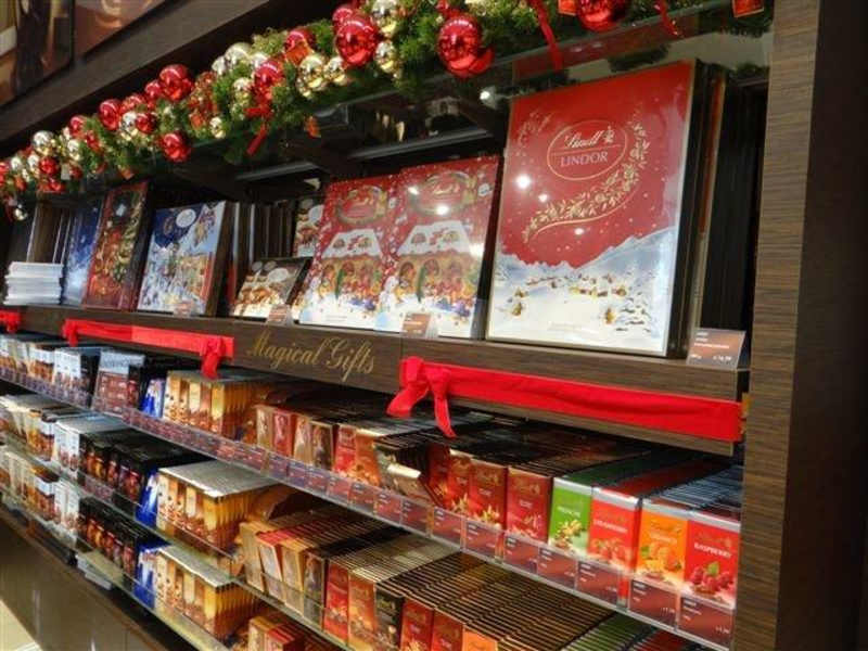 Mozartkugeln, große Auswahl an allen Lindt-Produkten, im Dezember v.a. alle weihnachtlichen Produkte, zudem Kaffee oder heiße Schokolade
