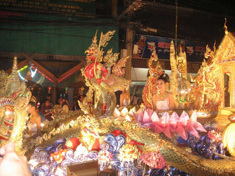 Loi Kratong findet in Thailand zum Ende der Regenzeit am 12. Vollmond des Mondkalenders statt, das ist meistens der erste Vollmond im November. Es ist ein schönes Fest, dass sich in Chiang Mai über drei Tage zieht. Tausende leutende Heißluftballons steigen in den Himmel (kenne vielleicht einige von Südthailand, kosten hier allerdings nur 25 BHT), auf dem Fluss lassen die Menschen geschmückte und beleuchtete Bananenstauden schwimmen, es gibt Live-Musik, eigens für das Fest eröffnete Märkte (u. a. am Taipee Gate und am Fluss) und der Höhepunkt ist allabendlich ein großer Umzug mit Musik, Tänzern und prächtig geschmückten Wagen. Dazu werden für mehrere Stunden ganze Strassenzüge gesperrt, was das herumschlendern vereinfacht und ein angenehme Atmosphäre schafft, aber es laufen wirklich sehr viele Menschen herum. Aber alles ist friedlich und entspannt. Lohnt sich auf jeden Fall, speziell am letzten Tag, dem eigentlich Vollmond, ist der Umzug üppig!!!!