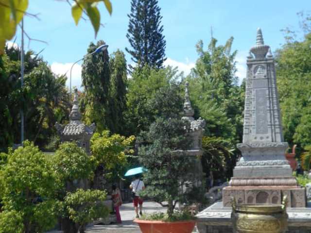 Der Bau der ursprünglichen Long Son Pagode im Jahr 1886 geht auf Thích Ngộ Chí zurück, der vor seinem Leben als Mönch in diesem Kloster Teil der antifranzösischen Kräfte war, die für ein freies Vietnam eintraten. Die heutige – zu Beginn des 20. Jahrhunderts an ihren jetzigen Standort verlegte – Pagode liegt in einem sehr schönen Gartengelände am Fuße eines Berges. Von den mehrfachen Zerstörungen, zuletzt durch den Vietnamkrieg, ist nichts mehr zu erkennen. Trotz der zahlreichen Besucher herrscht eine friedliche, fast stille Atmosphäre rund um die Pagode, weil es die Touristenströme auf den Berg zieht, von wo sie die Aussicht über die Stadt haben. Ich habe mir die 150 Stufen bis zum Gipfel erspart und fand den Aufenthalt im unteren Bereich der Anlage sehr entspannend.