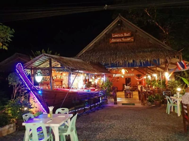 das Longtailboot liegt an der Hauptstraße Richtung Phuket . Hier gibt es die besten Cocktails ( 100 Baht ) und sehr leckeres Essen. Man wird jeden Abend begrüßt wie alte Freunde. Zum Abschied bekommt man immer ein wenig Obst ( Banane , Limone ) geschenkt. Mit dem Besitzer und seiner Crew hatten wir viele schöne Abende.