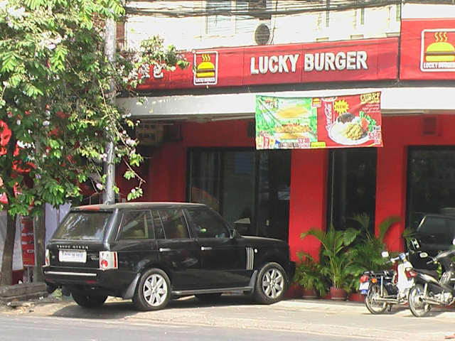 Auf den Monvivong Blvd. bevor es rechts weg geht an der Kreuzung , zum Kleider + Schmuck Markt gegenüber ist der Lucky Burger ( Preah Moonivong Blvd. ) , nicht nur ein Kambodschanischer Mc'i . In dem großen Restaurant ist gleich auf der linken Seite , die Eis Abteilung ( 3 Kugeln = 2, 40 $ ) . Sehr frische und aromatische Eissorten und die Eisauswahl > 15 Sorten . Zum mitnehmen oder auch zum dortigen verzehr. Gleich daneben kann man von oberhalb die ganzen Burger als Menue kaufen , zu erschwinglichen Preisen , oder auch selbst alles zusammen stellen wie man es möchte . Mit dem Bestell Zettel steht eine Nummer oben rechts ( z. B. 79 ) muss man warten bis sie aufgerufen wird vom Lautspprecher und die Bestellung vom Tresen abholen. Tisch selbst suchen ............. Hamburger + Chickenburger + Frenchfries + Orange Juce + Sundace Ice = 5 $ ( Dollar ) Hamburger + Hühnchenburger + Pommes Frites + Orangensaft + Eisbecher = 5 $ ( Dollar ) Schräg gegnüber befindet sich ein Kaffeeshop mit vielen variationen von Kaffee's und sehr viele Kuchen gibt es dazu zur Auswahl. Also 3 Geschäfte in einem klimatisierten Restaurant. ( Abend's kann's schon mal eng hergeh'n ) !