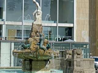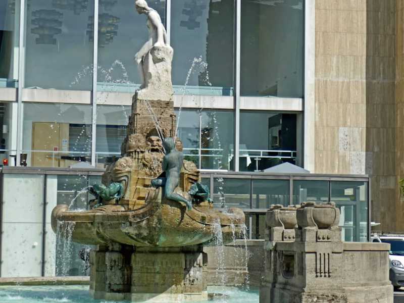 Der "Märchenbrunnen", auch als "Schauspielhausbrunnen" bekannt, befindet sich seit dem Mai 2006 an der Untermainanlage neben den Städtischen Bühnen Frankfurt. Die Brunnenanlage wurde zwischen 1901 und 1910 von dem Bildhauer Friedrich Christoph Hausmann im Jugendstil geschaffen und am 25. August 1910 eingeweiht. Der etwa acht Meter hohe, von einer Muschelkalkschale eingerahmte Brunnen verdankt seinen Namen den vielen Phantasiewesen, die ihn "bevölkern". Gekrönt wird er von einer Nixe aus weißem Tiroler Marmor, für die eine neunzehnjährige Wäscherin aus Frankfurt-Niederrad Modell gestanden haben soll. Das Wasser spritzt u.a. aus den Mäulern riesiger Fische, die von Putten gebändigt werden. Bei dem aktuellen Monument handelt es sich um ein in Nordkorea hergestelltes Duplikat. Homepage: https://www.kunst-im-oeffentlichen-raum-frankfurt.de/de/page156.html?id=129