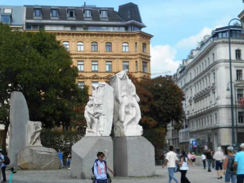 Das „begehbare Denkmal“ der Rückseite der Wiener Staatsoper erinnert mit verschiedenen Skulpturen aus Marmor, Granit und Bronze an die Opfer von Krieg und Faschismus. Dabei wird nicht nur der Toten gedacht, sondern auch die Entwürdigung und Erniedrigung von Menschen angeprangert, wie die Skulptur eines knienden, straßenwaschenden Juden zeigt.