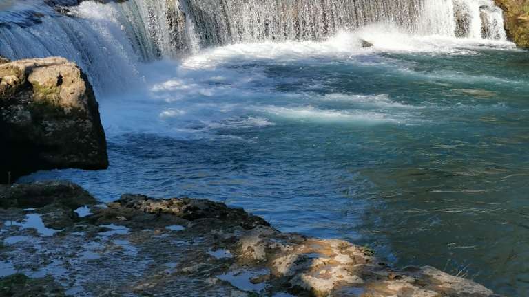 Kleiner Wasserfall, schönes Rauschen und viele Lokale im schattigen Plateau Touristisch aber sehenswert und erfrischend Viele schöne Fotomotive
