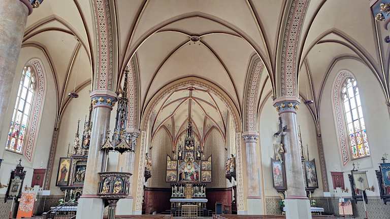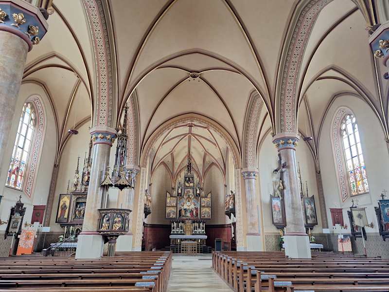 Die katholische Pfarrkirche Maria Himmelfahrt in Garmisch-Partenkirchen befindet sich im Ortsteil Partenkirchen in der Ludwigstraße 46. Eine erste Kirche in Partenkirchen gab es bereits im Jahr 1315. Im frühen 18. Jahrhundert wurde eine neue Kirche erbaut, die 1734 eingeweiht wurde. Diese Kirche fiel jedoch dem großen Stadtbrand vom 05.12.1865 zum Opfer (bei diesem Brand wurden insgesamt 67 Gebäude zerstört). Der Neubau der Kirche erfolgte zwischen 1868 und 1871. Im 20. Jahrhundert erfolgten mehrere Umbauten, neue Glocken wurden eingebaut. Weiter Innenrenovierungen und Außenrenovierungen folgten. Die Orgel wurde im 20. Jahrhundert zweimal ersetzt (1926/1927 und 1990/1991). Wenn man durch die historische Ludwigstraße läuft und sich die tollen Lüftlmalereien anschaut, so kommt man auch an der Kirche Mariä Himmelfahrt vorbei, die leicht erhöht oberhalb der Straße steht. Man sollte diese Kirche nicht nur von außen anschauen, sondern auch von innen. Dabei ist besonders der Hauptaltar interessant. Es ist ein Flügelaltar, der im offenen Zustand die Aufnahme Marias in den Himmel zeigt. Im geschlossenen Zustand sieht man die Kreuzigung Jesus. Die beiden Seitenaltäre sind ebenfalls interessante Flügelaltäre. Der linke Seitenaltar zeigt offen drei Heiligenfiguren (die Heilige Katharina, Maria mit Jesus auf dem Arm und die Heilige Barbara), geschlossen sieht man Jesus am Ölberg. Am rechten Seitenaltar sieht man (offen) das Bild der Pieta (die trauernde Maria mit dem Leichnam von Jesus auf ihrem Schoß), auf den Flügeln links und rechts den Heiligen Sebastian und den Heiligen Florian und (geschlossen) die Verspottung Jesus. Ansonsten findet man in der Mariä-Himmelfahrts-Kirche: Jesus am Kreuz, mehrere Heiligenfiguren, die Kanzel und einen schönen, geschnitzten Kreuzweg.