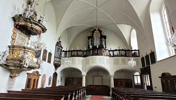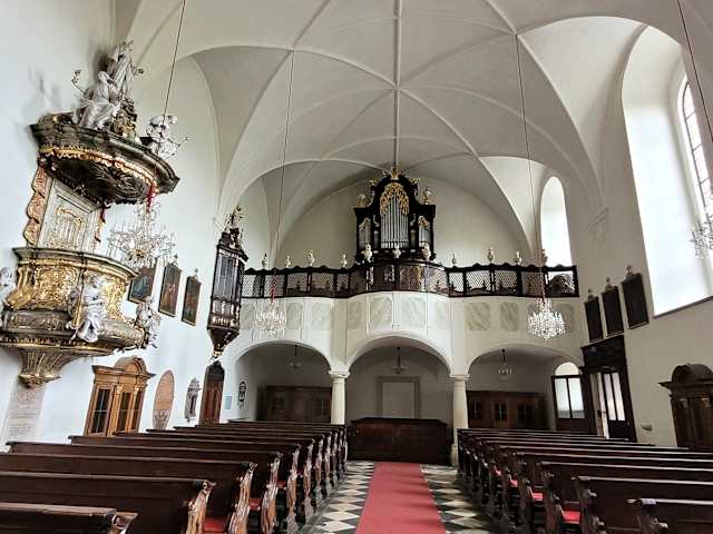 Die römisch - katholische Marienkirche wurde 1624 erbaut und gehört zum Franziskanerkloster, das später von den Benediktinern betreut wurde. Deshalb heisst der Platz an der Kirche auch Benediktinerplatz.. Später btreuten die Jesuiten die Kirche. Die Kirche ist ein barocker Bau, der vom äusseren eher schlicht ist. Das Innere der Kirche kann sich sehen lassen. Der wunderschöne Hochaltar stammt aus dem Jahre 1747 und er Triumphbogen hat sehenswerte Fresken.