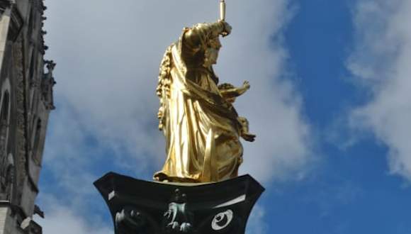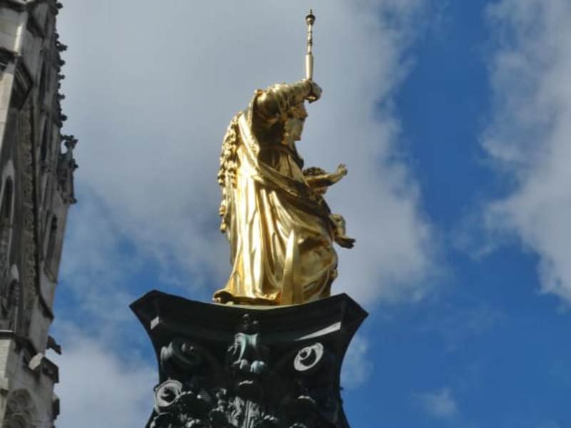 In München steht mitten auf dem Marienplatz, vor dem Neuen Rathaus, die Mariensäule. Es ist eine ca. 11 Meter hohe Säule, die auf einem ca. 3 Meter hohem Sockel steht. Oben auf der Säule steht eine 2 Meter große vergoldete Marienfigur. Maria ist hier als Patrona Bavariae, als Schutzheilige Bayerns, dargestellt. Maria steht auf der Mondsichel, auf dem linken Arm hält sie ihren Sohn Jesus, in der rechten Hand hält sie ein Zepter. Auf dem Kopf trägt Maria eine Krone. Dies alles glänzt in Gold. Die Mariensäule wurde 1638 errichtet und geweiht. Die Figur der Maria ist jedoch älter, sie wurde wohl 1593 als Grabfigur für Wilhelm V. von Bayern (auch Wilhelm der Fromme genannt, geboren 1548, von 1579 bis zu seiner Abdankung 1597 Herzog von Bayern, gestorben 1626) erschaffen. Als die Figur der Maria also geschaffen wurde, lebte Wilhelm V. noch viele Jahre. Das mag auch Grund sein, warum diese Maria-Statue in die Frauenkirche kam und dort bis 1613 den Hochaltar zierte. Als die Mariensäule 1838 aufgestellt, kam die Marienfigur auf die Mariensäule und somit auf den Marienplatz. Die vier Bronzeputten, die sich am Fuß der Säule auf dem Sockel befinden, wurden 1639 hinzugefügt. Im Zweiten Weltkrieg wurde die Maria-Statue von der Säule genommen und zu ihrem Schutz in der Frauenkirche gelagert. Als in München die U- und S-Bahn gebaut wurde, wurde die Mariensäule mitsamt Sockel und Figuren 1966 abgebaut und 1970 wieder aufgebaut. Die Mariensäule mit der goldenen Maria ist eine der Top-Sehenswürdigkeiten Münchens und man muss sie unbedingt gesehen haben.