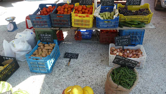 Im "Stadtteil" Pallada von Tinos Stadt, direkt am Busbahnhof, ca. 200 Meter vom Anleger der großen Fähren entfernt findet Mo bis Sa von 7.30 Uhr bis 13.30 Uhr ein schöner kleiner Markt mit regionalen Produkten von Tinos statt. Wer sich im Appartment selbst verpflegt, kann aus dem Obst- und Gemüseangebot aus dem vollen schöpfen. Als kulinarische Mitbringsel für zu Hause bieten sich Gewürze, getrocknete Tomaten oder Kapern, für die Tinos berühmt ist, an. Für bezahlbares Geld kann man die Kapern hier kiloweise kaufen!