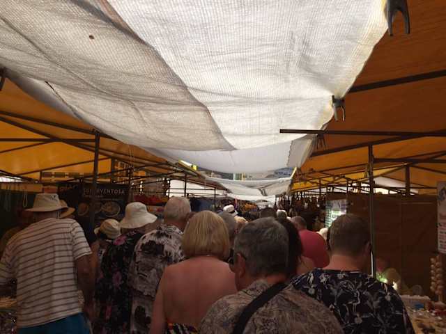 Jeden Sonntagmorgen ab 10 Uhr herrscht auf dem Wochenmarkt in Los Christianos großer Trubel . Tausende kommen um die bunten Auslagen der Händler zu bestaunen . Ob man hier echte Schnäppchen macht ist zu bezweifeln, aber die Atmophäre ist einfach toll . Vorsicht vor Taschendieben !
