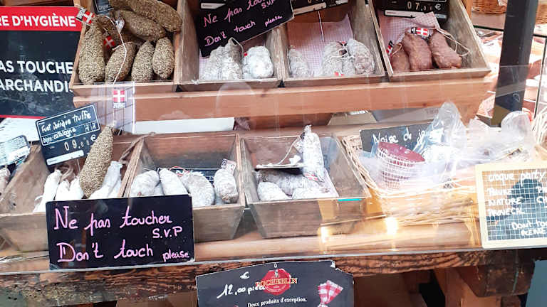 Käsegeruch schon vom aussen! Ein Paradies für Feinschmecker. Besonders für uns als Käseliebhaber. Viele viele Theken mit Spezialitäten, der ganze Bauch Frankreichs und Elsass steht hier zum Verkauf. Man kann auch was probieren.
