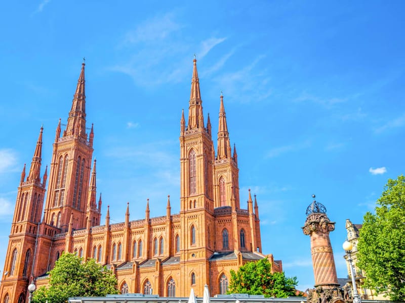 Die Kirche direkt am Marktplatz ist ein beeindruckender Bau, der in neogotischem Stil mit klassizistischer Ornamentik vollständig aus Ziegeln errichtet wurde. Der Hauptturm ist mit seinen 88 Metern das höchste Gebäude von Wiesbaden, die vier Ecktürme sind deutlich niedriger aber mit 58 Metern (für die Seitentürme) bzw. 73 Metern (für die Chortürme) immer noch beeindruckend.