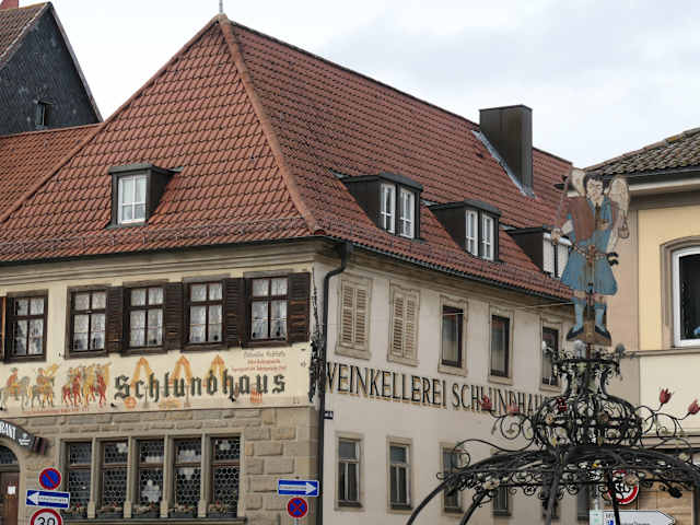 Auf dem Marktplatz von Bad Königshofen stehen drei Brunnen und der sogenannte Kornmessstein. Rund um den Marktplatz befinden sich einige schöne Gebäude, wobei das Rathaus und das Schlundhaus besonders auffällig und beachtenswert sind. Aber ich muss sagen, dass der Marktplatz (wie auch die gesamte Altstadt) bessere Tage gesehen haben.