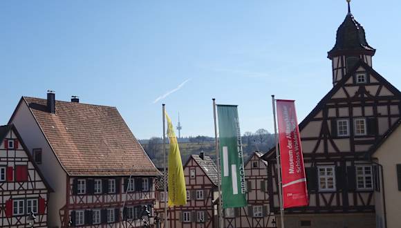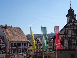Schon um 1500 standen Fachwerkhäuser auf dem Marktplatz. Das erst Rathaus 1575, das Widmer Stammhaus 1570, das Dannecker-Haus 1620. Am Marktplatz steht auch die St. Veit Kirche. Ein schöner Brunnenaus dem Jahr 1728, schmückt den Platz. Auf dem Platz ist auch eine Fläche mit einem Freiluft-Schach.