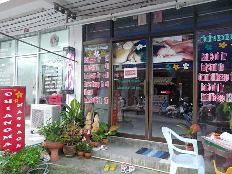 100 m vor der Einmünding in die Ringroad, kommend von der einzigen Kreuzung an der Beachroad und dort rechts abbiegend, liegt auf der rechten Seite neben dem Lamai View die CHIANG MAI MASSAGE. Öffnungszeiten: 10.30 - 23.00 Uhr . Die Öffnungszeiten sollte man, wie in Thailand üblich, nicht so genau nehmen, da die Chefin MAI allein massiert und auch noch einen englischen boyfriend/sponsor hat. Realistisch erscheinen mir Zeiten von 11.30 - 21.oo Uhr. Tel.: 084-465 2168 Die Preise beginnen ab 200 THB/Stunde und sind äußerst preiswert. Da sollte bei Zufriedenheit auch noch ein 10-25% iges Trinkgeld drin sein. Um es deutlich zu sagen: Erotische Extras gibt es bei MAI absolut nicht, dafür eine richtig gute Thaimassage!
