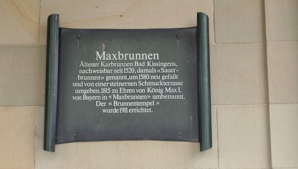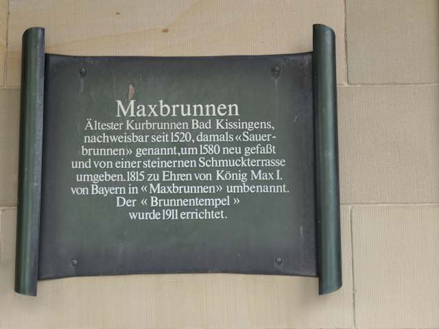 Bad Kissingen hat insgesamt 7 Heilbrunnen, der bekannteste ist die Rákózi-Quelle, der älteste ist jedoch der Maxbrunnen, der bereits 1520 erwähnt wurde. Im Jahr 1815 wurde, während der Regentschaft des bayerischen Königs Max I. Joseph, der Brunnen neu eingefasst und trägt seit dieser Zeit den Namen Maxbrunnen. Im Kurgarten befindet sich der sogenannte Maxtempel, aus dem das Wasser dieser Quelle fließt. Der Maxtempel und der Wasserauslass sind für alle zugänglich und jeder kann hier Wasser trinken (oder evtl. auch etwas in Flaschen abfüllen). Zudem wird in der Brunnenhalle (in der Wandelhalle) auch das Wasser der Maxquelle zu bestimmten Zeiten „ausgeschenkt“. Der Maxbrunnen wird teilweise auch als Sauer-Brunnen bezeichnet. Jeder, der nach Bad Kissingen kommt, sollte mal die Heilwässer kosten, dazu eignet sich der Maxbrunnen am Maxtempel besonderst gut (evtl. sollte man einen Trinkbecher, Tasse oder Glas mitbringen).