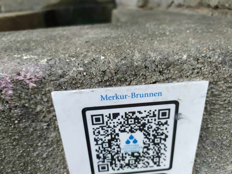 Ein schöner Brunnen befindet sich beim Graf-Eberhard-Bau in Stuttgart. Das Becken ist viereckig und das Wasser läuft aus einem Rohr 9in der Wand des Gebäudes in das Becken. Neben dem Becken befindet sich eine Bank. Der Brunnen wurde 1909 gestifte und aufgestellt. An der Rückwand des Becken ist ein Relief aus Muschelkalk. Es zeigt Merkur. Auf dem Kopf trägt er eine Art Reisehut.