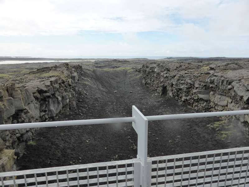 Dies ist eine Brücke über einen Grabenbruch auf der Reykjanes Halbinsel. Island liegt auf dem Mittelatlantischen Rücken, der hier als Oberflächen-Rift zutage tritt. Die eurasische und die nordamerikanische Platte driften hier auseinander und bilden eine von S-W nach N-O diagonal durch Island verlaufende Risszone. Somit kann man bildlich gesprochen mit einem Bein in Europa und dem anderen Bein in Nordamerika stehen.
